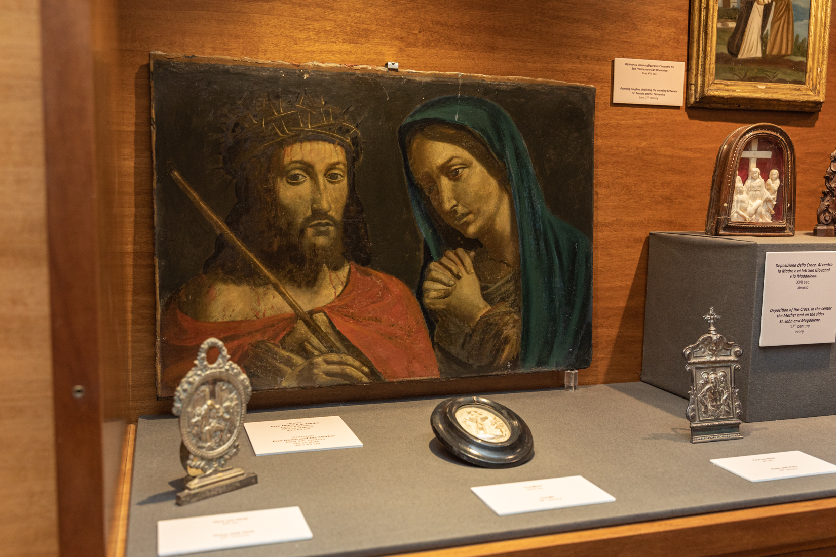 la cuarta sección, titulada Cultura y Espiritualidad, muestra ornamentos litúrgicos, objetos de uso religioso y cotidiano, enriquecidos con reflexiones didácticas sobre temas como el crucifijo sangrante;